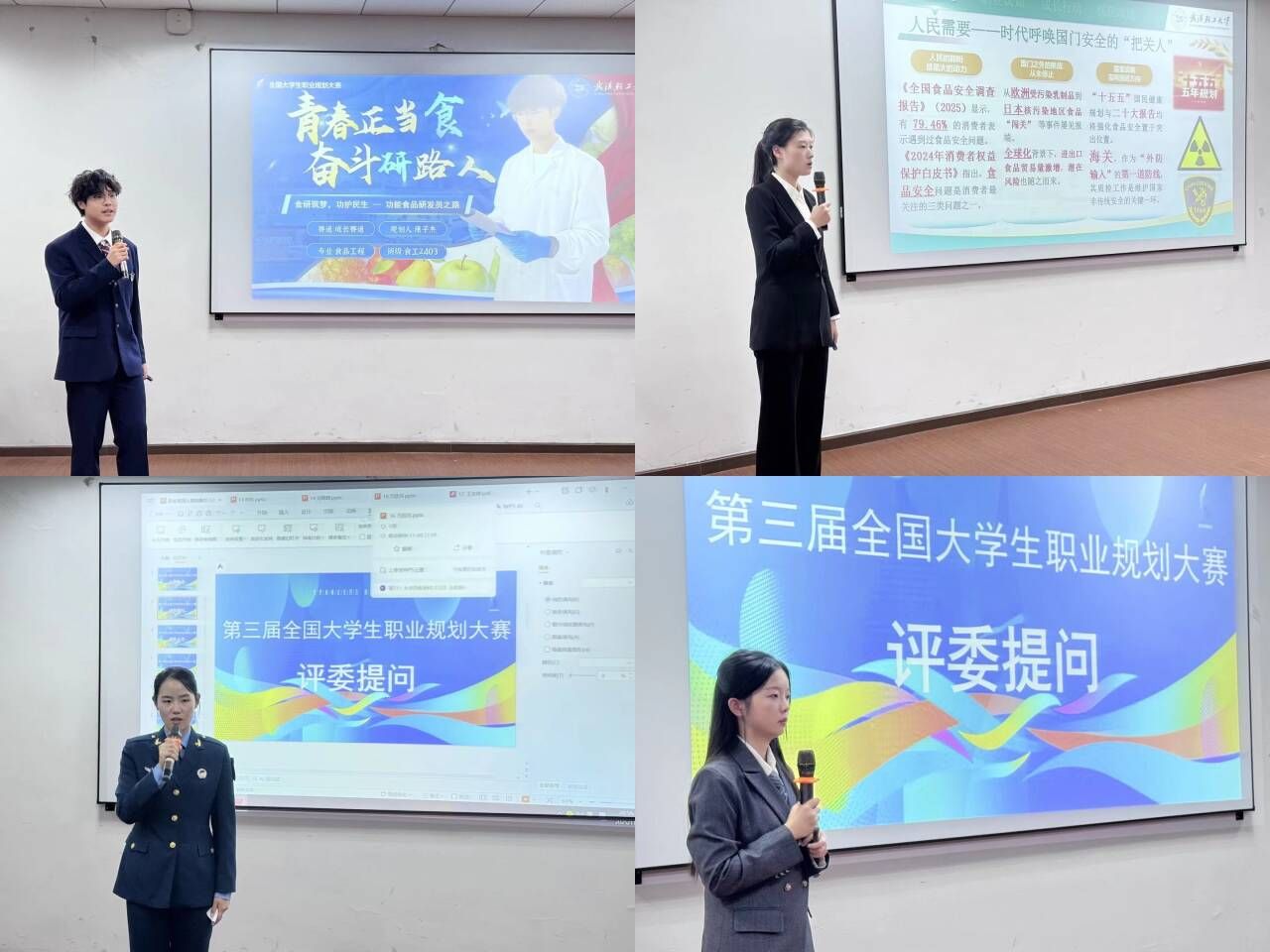 决赛现场,选手们通过清晰的职业陈述、精美的PPT展示及从容的现场答辩,全面展现个人职业规划的深度与广度。规划方向覆盖多元领域,从生物医学材料研发、谷物科普推广到微藻类食品研发、低GI食品研发等功能性食品赛道,从对食品行业发展路径的深刻洞察到真挚的家国情怀,每位选手都描绘出独具特色又充满希望的职业蓝图,展现出更成熟的职业思考。评委老师们围绕规划可行性、行业适配度、职业发展路径等方面展开专业分析与精准点评,为选手们提供了极具针对性的指导建议。